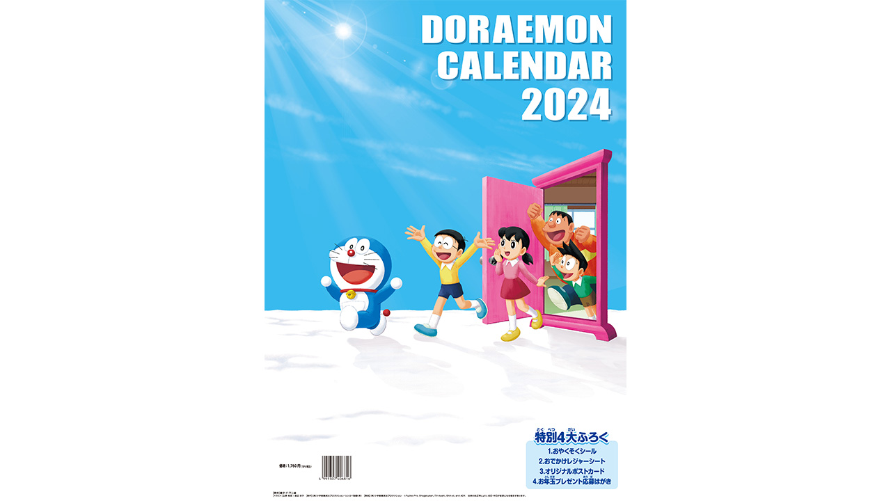 今回のカレンダーもオール描(か)きおろし! おやくそくシール、おでかけレジャーシート、オリジナルポストカードなどの特別4大ふろくがついた豪華(ごうか)なカレンダーだよ。2024年も、やさしいイラストのドラえもんたちと楽しくすごしてね☆